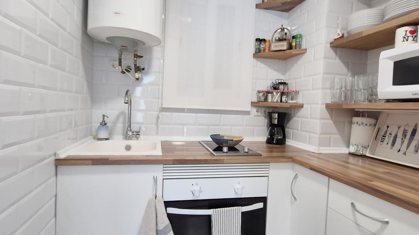 The interior has been updated throughout and provides a sunny living space. The lounge area is compact yet comfortable, fitted with sofa beds that allow for additional sleeping space when required. The adjoining kitchen is fully equipped with all the necessary appliances and storage, making it suitable for everyday use as well as for longer stays.